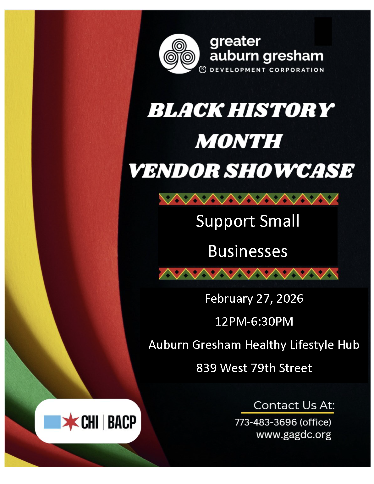 Back to All Events Black History Month Vendor Showcase Friday, February 27, 2026 12:00 PM 6:30 PM Greater Auburn Gresham Development Corporation 839 West 79th Street Chicago, IL, 60620 United States (map) Google Calendar ICS